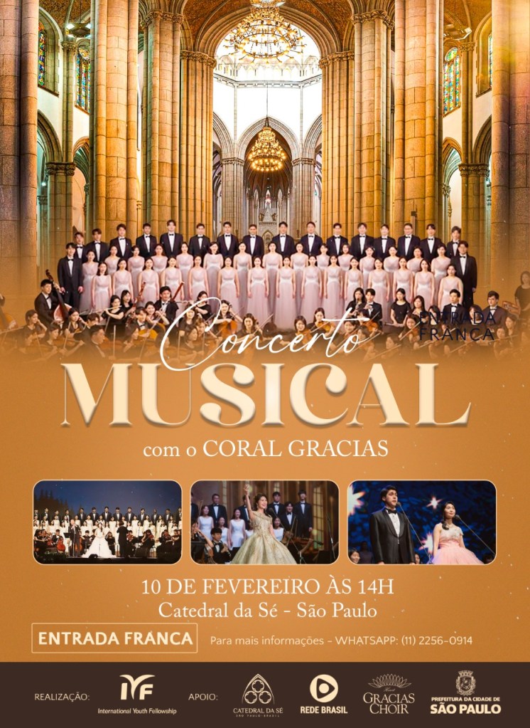 Além disso, a apresentação do Gracias Choir (45 minutos) e a mensagem do fundador Pastor Ock Soo Park (30 minutos) irão aquecer o coração dos participantes em uma das catedrais mais famosas do Brasil.